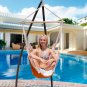Did you ever think of laying outside on the hanging chaise lounge chair, relaxing and dreaming? Here at Lazy Daze Hammocks, we are so proud to recommend you this dream chair to help you to kick off the season with. Recline on this dream chair, start to relax care-freely after work all day long. The removable umbrella at the very top allows for comfortable shade relief from the sun. The large piece of padded cushion and head pillow are filled with around 2 inches of foam, which creates comfort fully. Foam covered armrests add relaxation to a large extent. The base is designed with legs added stability and the legs are capped with rubber feet. Easy to assemble.